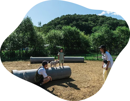 キャンプの合間に、わんちゃんを思いっきり走らせて運動不足やストレスを解消させるのはいかが?キャンプサイト宿泊者は「ワクチン接種証明書」と「狂犬病予防接種証明書」のご提示でドッグガーデンを無料でご利用できます。ベンチに座ってわんちゃんが遊ぶのを眺めるのも良し、いっしょに土管で遊ぶのも良し。たっぷり遊んだ後は近くの水場で、わんちゃんをリフレッシュさせてあげることもできます。