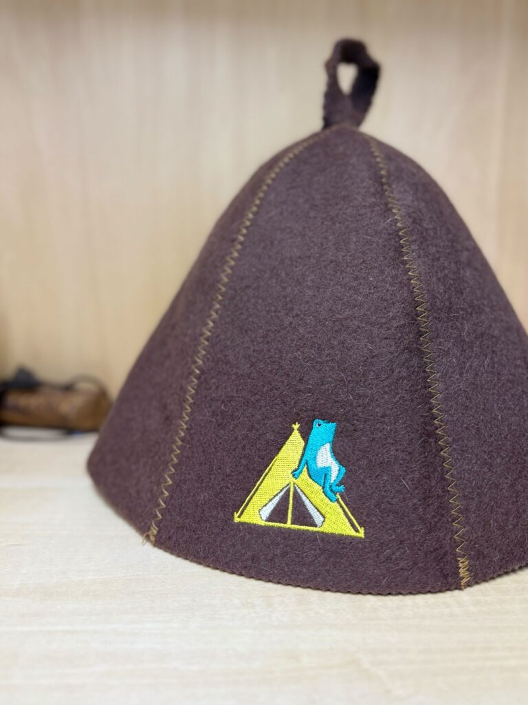 フェルト素材で頭部をしっかり保護し、デザインもかえるロゴ入り!サウナ後の記念撮影にもぴったりです。